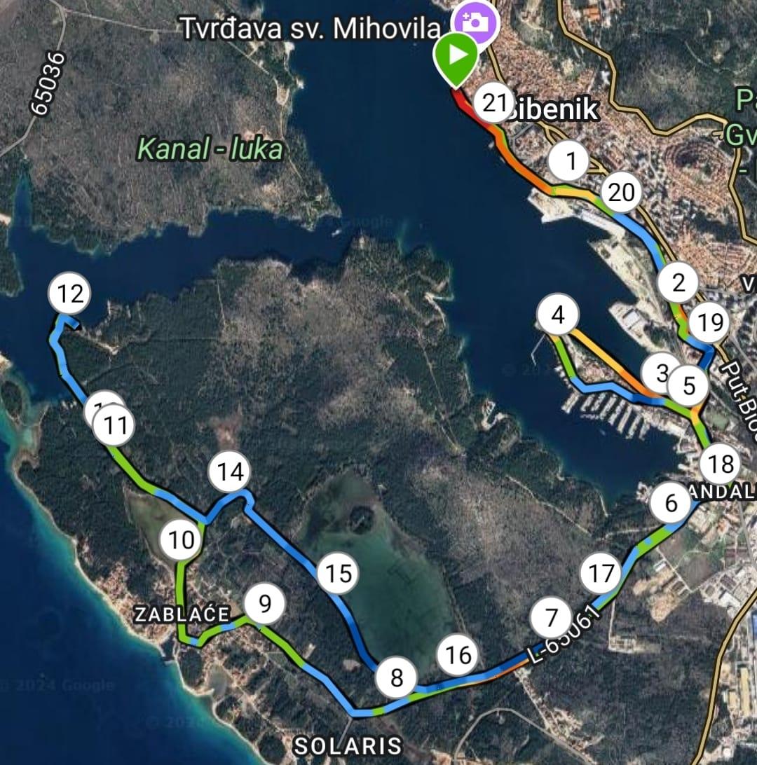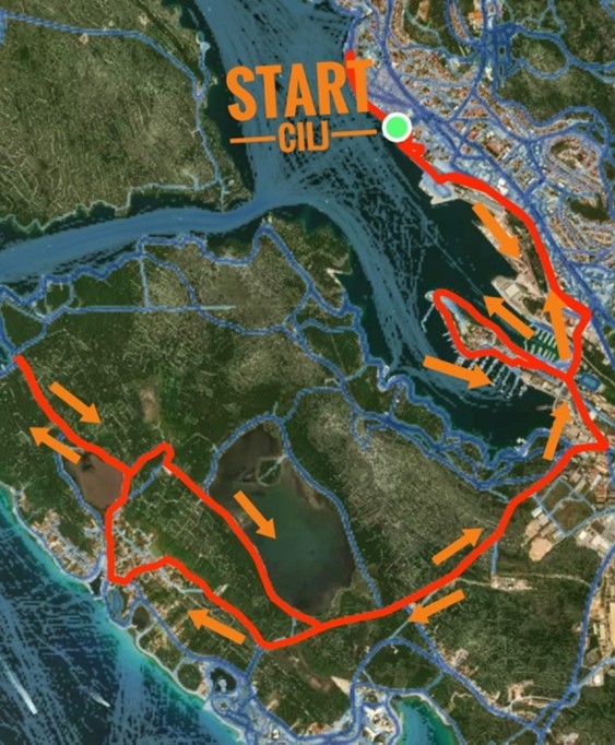 Polumaraton obuhvaća trasu od stare gradske jezgre i rive, kroz tunel u smjeru Mandaline, nastavak prema Zablaću, Malim i Velikim Solinama te šetnici sv. Ante sve do posjetiteljskog centra Javne ustanove „Priroda“. Nakon okreta, trkači se vraćaju prema gradu istom trasom, bez ponovnog ulaska u područje Marine Mandalina. Utrka od pet kilometara dijeli početni dio trase, s okretom kod Kauflanda i povratkom prema cilju na rivi.